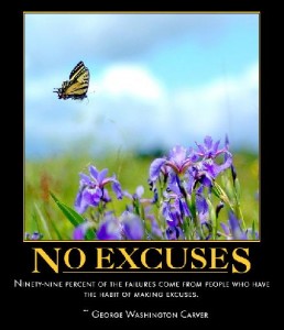 When I’m asking myself this question “ What are my excuses ?” exactly in this moment I’m saying that sometimes the fear  of succes,the fear of being judged by others is stopping me ,to put in practice what I’m planning.Another excuses that I’m using is that I’m so different and in the same time distractions usually around me ( facebook,my  e-mail address which is always open and the biggest one multitasking activities) and after all of this a part of me is feeling that I don’t have enough time in a day to finish what I’ve been planning before.
